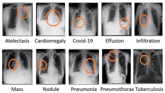 A CXR image assists medical professionals in the diagnosis of several respiratory disorders. Doctors may identify a variety of illnesses, including pneumonia and COVID-19, by analyzing CXR images. Figure 1 depicts a variety of respiratory illnesses that medical professionals may identify [13]. Science advances continuously, and the medical area of CXR patient assessment is no exception. However, mistakes might occur while conducting CXR screening [14]. Some medical facilities in nations with few resources and dense populations lack the essential or modern equipment to conduct CXR screening [15]. The sooner COVID-19 is identified, the more successful the therapy will be, in turn decreasing the risk of infection, as well as the spread of illness. COVID-19 and viral pneumonitis are fatal respiratory diseases. They are dangerous because they may spread quickly among humans [11,16]. To diagnose any condition, clinicians often examine and focus on a particular region of the CXR of a patient. A computer with image processing capabilities may segment, analyze, and filter CXR images to enhance the diagnostic performance by enabling a neural network to forecast illness. Doctors can more quickly and accurately diagnose pneumonia from a chest X-ray thanks to computer-aided diagnosis (CAD). The application of artificial intelligence methods in healthcare is growing as a result of their potential to handle very large datasets [17].
