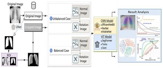 The remaining sections of the paper are as follows: The original UNet model for lung segmentation, exclusive pretrained CNN models, and transformer models for image classification are summarized in Section 2. The proposed study’s methodology, suggested system, dataset utilized in the tests, and augmentation phases are all described in Section 3. The experiment results for the unsegmented CXR images, segmented CXR images, and each kind of image with and without augmentation are provided in Section 4. A performance comparison between the proposed system and more recent systems is also provided in this section. Section 5 concludes the study and offers ideas for the next research.