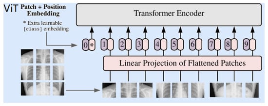 In the proposed system, three versions of ViT are adopted. These are Twins, Swins, and Segformer. The input image is split into several patches, usually in the shape of height × width × channels. In addition, the augmentation rotation is performed individually. The input image splits into patches, and those patches are the same size in height and width. The size of the Swin and Twin transformers is 800 × 800, whereas the size of the SegFormer is 512 × 512. The transformer learns how to follow a pattern by measuring the relationship between the input token pairs. Most input token pairs for cropped images are 0 (black). Then, the input images are ready for the next step, which flattens the images to reach the next level. This feeds the sequence of flattened images to the next step, which is encoding inside each transformer. In the encoder, there are three main layers. A multi-head self-attention layer linearly concatenates all of the attention outputs to the appropriate dimensions. The several attention heads aid in the training of the local and global dependencies in an image. A multi-layer perceptron layer is made up of two layers with activation functions. A normalization layer is inserted before each block as it has no new dependencies between the training images. As a result, the training time and overall performance are improved. A simplified block diagram of CXR image processing using the ViT is shown in Figure 4.