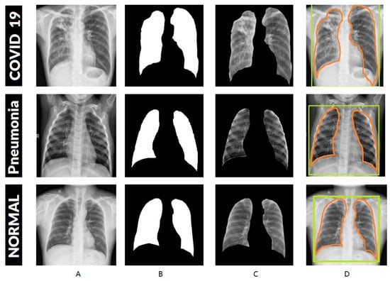 UNet output segmentation results for three samples from different three classes for lung CXR images. (A) shows the original images. (B) shows the results of UNet. (C) shows the results after ROI extraction. (D) shows the process of labeling the lungs.