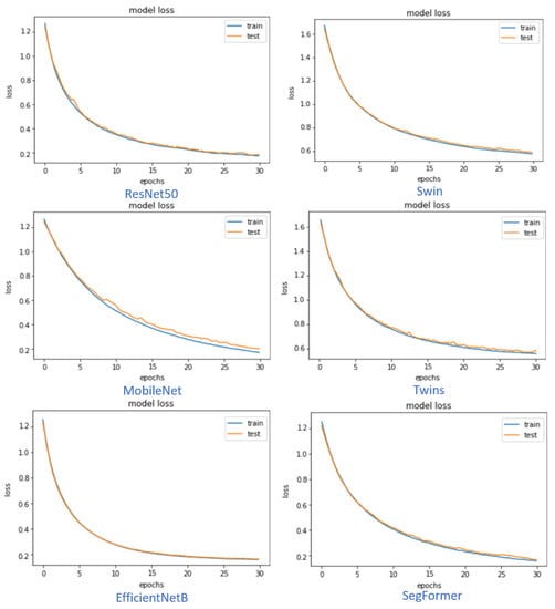 Figure 6 shows the training and testing loss versus epochs for the different models of CNN and ViT. It is shown that the CNN EfficientNetB7 model and the ViT Segformer-B5 model curves are smoother than the others within the same type of models. Most of the models’ loss graphs are smooth, and the system is nicely converged. The figures are achieved using augmented and segmented lung CXR images.
