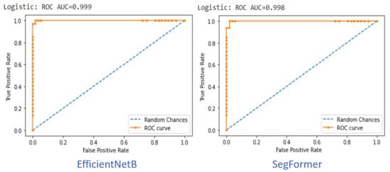 Comparison between best results between EfficientNetB7 “CNN” and SegFormer-B5 “ViT” using ROC-AUC. In both cases, the AUC is very close to 1.0.
