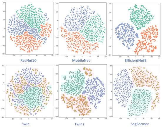 Figure 8 visualizes the class-separation capability of the different CNN-based and ViT-based models. The EfficientNetB and Segformer models have better class-separation capability than the other models. Figure 9 shows the grad-CAM images of six models for two samples.