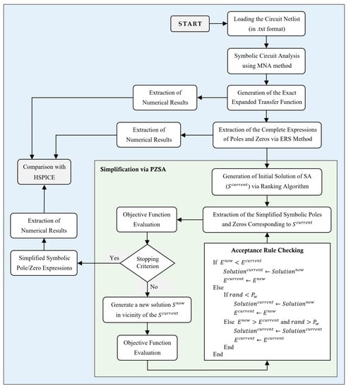 In this study, a simplified symbolic pole/zero extraction technique is presented based on an extension of the root splitting technique [14] and SA [15]. In this regard, we first introduce an enhanced root splitting (named ERS) for the symbolic pole/zero extraction from the exact transfer function. In this method, pole/zero displacements cannot exceed a pre-specified threshold. Then, we apply a metaheuristic-driven simplification method based on SA (named PZSA) to simplify the derived pole/zero expressions. Our main motivation is to mathematically formulate the pole/zero simplification problem in analog circuits as a multi-objective constrained optimization problem. The established problem can be solved by the use of optimization algorithms such as heuristics, single-solution metaheuristics, or population-based evolutionary and swarm intelligence algorithms. Thus, this paper applies a combined heuristic–metaheuristic algorithm based on the heuristic information available in the circuit model and SA to solve the symbolic root simplification problem. The key contributions outlined in this study can be characterized as follows: