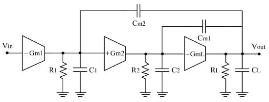 The block diagram of a three-stage compensation OTA is shown in Figure 6. The circuit is described by the RCgm model. First, the exact expanded TF is derived according to Equation (43) using the MNA technique. Next, by applying the simplification algorithm in [26], the simplified expanded TF is obtained according to Equation (44). By performing PZSA, 3 poles and 2 zeroes can be achieved as Equations (45)–(49).