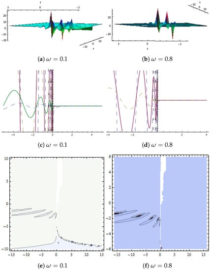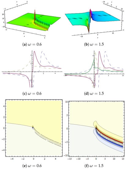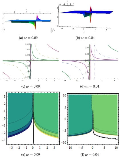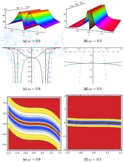 (a,b) show 3D graphs and (c,d) represent 2D graph. Dynamical presentation of solution in Equation (57) with and (e,f) show contour plot.
