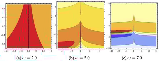 Behaviour of in Equation (39) presented with and (a–c) show contour graphs for various values of .