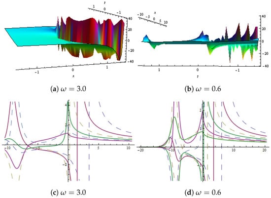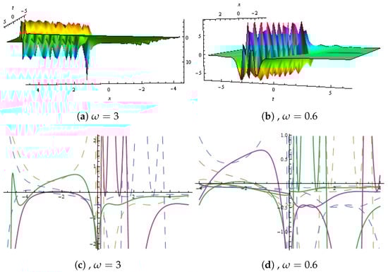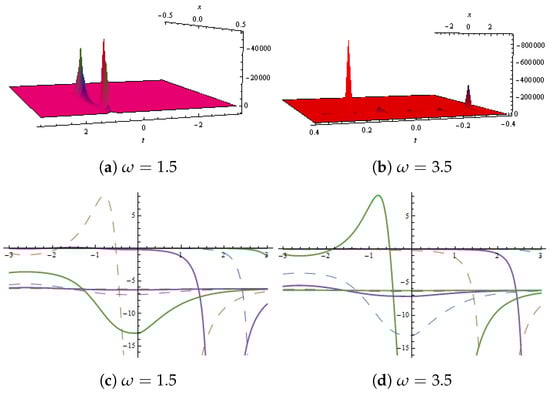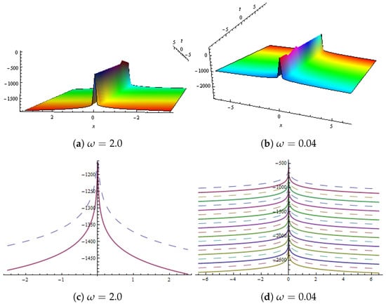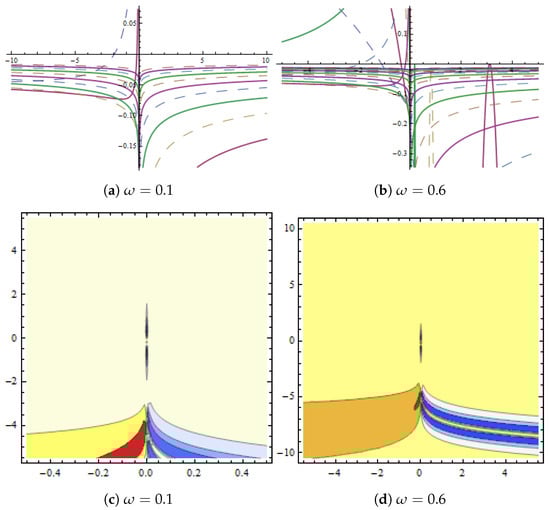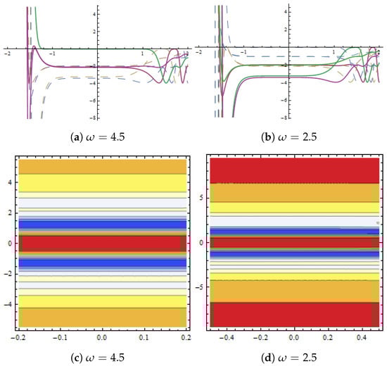 Dynamical behaviour of in Equation (38) presented with and (a,b) show 2D plots and (c,d) represent contour plots for different values of .