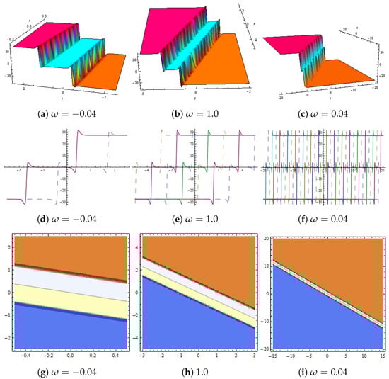 (a–c) show 3D graphs. Dynamical representation of solution in Equation (33) with (d–f) show 2D plots and (g–i) represent contour graphs for various values of .