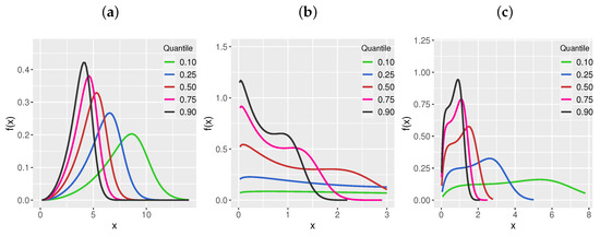 The gamlss package in R [42] is used to find the maximum likelihood estimate of . This package comes from the general class of generalized additive models for location, scale and shape (GAMLSS) (Rigby and Stasinopoulos [43]). These models allow all parameters of a distribution to be modeled as a function of covariates, such as non-parametric, parametric and/or additive smooth functions. Furthermore, they do not have the restriction that the response distribution belongs to a given family such as the exponential family. The package basically has two algorithms: CG (Cole and Green [44]) and RS (Rigby and Stasinopoulos [43]), whose acronyms come from the names of the authors. These algorithms are stable and do not require precise initial values to guarantee convergence. For this reason, we work with the RS algorithm with initial values for and obtained from the fitted Weibull QR model (). Compared to the CG algorithm, RS is faster for larger datasets and does not use the expected value of cross derivatives, which can be useful when these values are equal to zero. For more details of the algorithms, see [43].
