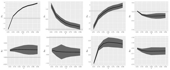 Point estimates and 95% confidence intervals for the parameters versus from the fitted ELLOW QR model under structure for the gastric cancer data.