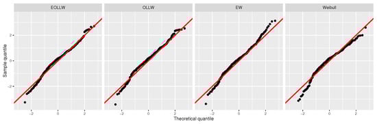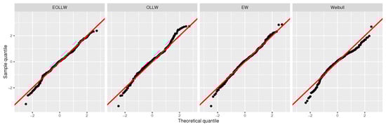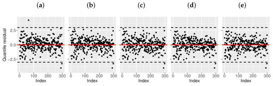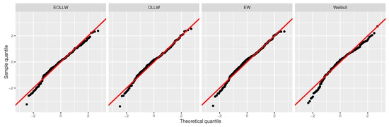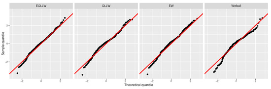 Figure 4, Figure 5, Figure 6, Figure 7 and Figure 8 provide the normal probability plots of the ’s in Equation (20) under structure for some quantiles. They reveal that the EOLLW QR model is the best among the fitted models. Further, they approximately follow a standard normal distribution, thus indicating adequate fits. Figure 9 shows the index plot of the ’s for the EOLLW QR model under structure . There are few points outside the interval for both quantiles, and a random pattern around zero which show that these models are very adequate to the current data.