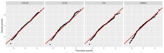 We consider the following quantiles: , , , and . Table 6 reports the Akaike information criterion (AIC) values for the fitted QR regression models. The EOLLW QR model under structure gives the lowest values for these quantiles.