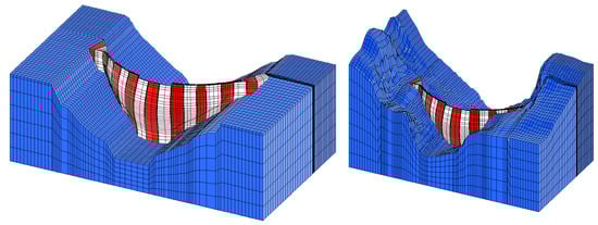 As an illustrative example, a real application of this methodology is shown. It is a finite element model of a dam that was initially generated by “cutting” it into a parallelepiped, as can be seen in Figure 1. The model was then modified to include the DEM, applying the described technique.