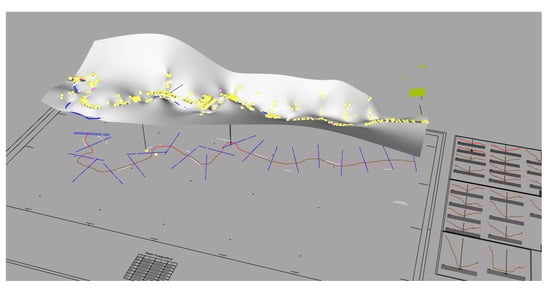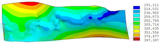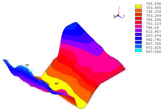 The DEM was obtained applying the methodology explained in this article. The same finite element program used for the stress–strain calculation of the structure was used to create the DEM. From a base of 13 × 21 points and a finite element mesh of 4000 nodes, the terrain topography was created and included in the model (with the resulting DEM shown in Figure 2).