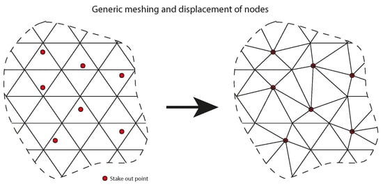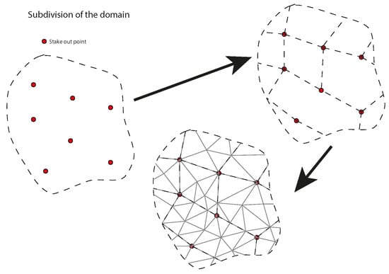 In this approach, the domain is divided into subdomains by conducting a triangulation of the initial domain using the stake out points as vertices of the triangulation. Then, the subdomains are meshed, imposing continuity on the mesh at the boundaries between subdomains (Figure 4).