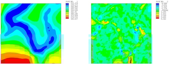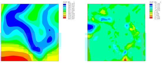 The results are shown hereafter (Figure 7, Figure 8, Figure 9, Figure 10, Figure 11, Figure 12, Figure 13, Figure 14, Figure 15, Figure 16, Figure 17, Figure 18, Figure 19, Figure 20, Figure 21 and Figure 22). The image on the left shows the obtained DEM, and the image on the right shows the differences contour plot, where the difference is obtained as the obtained height minus the height of the high-resolution DEM. Obviously, this cannot be treated as an error in the methodology but can give an idea of how the methodology adapts a plane surface to a topographical surface, with the smoothness of the slopes compared to the ones found in a typical landscape, etc.