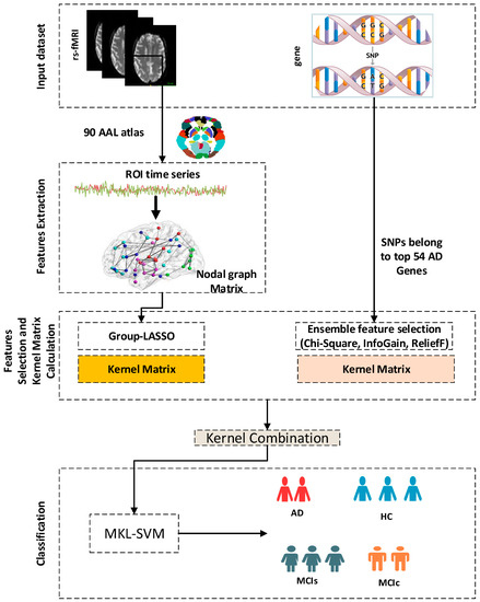 Functional MRI (fMRI) [6] has been widely employed as an imaging modality in brain research. The blood oxygenation level dependency and real-time in vivo imaging of brain activity using fMRI are beneficial for the production and analysis of hemodynamic changes [7]. More can be learned about aberrant network connections between mental and neurological disorders by examining the functional or structural network topology among patients. Network analysis techniques are widely used to detect brain abnormalities early in life [8,9]. In addition, a high-throughput genotyping method of large-scale population DNA samples was examined in previous studies (GWAS) [10] to detect the gene copy number variation or SNPs, which are high-density genetic markers. This method effectively determines disease susceptibility. Genetic variables significantly influence many aspects of health according to GWAS-based research to evaluate SNPs data for the progression of AD [11,12]. Dukart et al. [13] achieved an efficiency of 76% using Naive Bayes to distinguish between stable and transient MCI using PET as a specific biomarker. The efficiency increased to approximately 87% when integrating apolipoprotein E (APOE) information with imaging data. According to Dukart et al., the inclusion of genetic elements can assist imaging features to achieve higher classification accuracy. Graph theory topological metrics, which are parts of the brain’s functional connectome, have become crucial imaging biomarkers to better understand brain networks and identify neurodegenerative disorders [14,15]. The functional connectome systematically shows that the network’s nodal graph metrics, such as degree, participation coefficient, and shortest path length; global graph metrics, such as small world, modularity, and global efficiency; as well as functional connections among brain regions have disease diagnosis potentials. This offers a novel technique to spot altered brain network patterns [15,16]. Important aspects of brain networks have been chosen using sparse approaches, such as the least absolute shrinkage and selection operator (LASSO), because of the higher number of connectome features in the brain [9]. The LASSO regression analysis approach for feature selection and regularization can be used to choose nodal graph metrics and preserve strong discriminative nodal features [17]. In the recent past, methods to combine and identify brain regions have been developed using data-driven techniques and machine learning algorithms. Support vector machines (SVMs), Naive Bayes [18], and deep neural networks [19] have been used to identify individuals with MCI and healthy controls (HCs) [20]. However, most of these techniques isolate only one modality feature, resulting in poor classification performance. Multimodal characteristics should be utilized to offer a thorough and relevant knowledge of biomarkers in patients with AD. Multiple-kernel-learning SVM (MKL-SVM) [21] can assess the contributions of peculiar biomarkers to classification and partially ease the high-dimensional multiple-features problem.