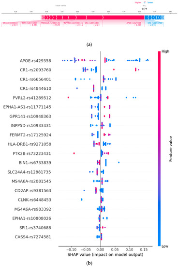 SNPs feature importance and their corresponding loci used in this study: (a) force plot representing important gene features and (b) top 20 SNPs. As the SHAP value of an SNP increases, the probability of AD is higher.