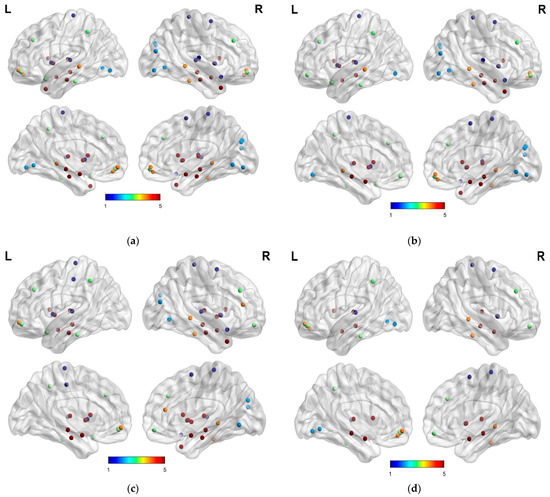 Highly discriminative brain networks nodal feature for (a) AD vs. HC, (b) HC vs. MCI, (c) AD vs. MCI, and (d): MCIs vs. MCIc.
