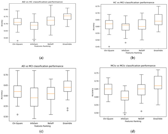 Effect of ensemble features selection on Classification accuracy for Alzheimer’s-associated SNPs genes using MKL-SVM: (a) AD vs. HC, (b) AD vs. MCI, (c) HC vs. MCI, and (d) MCIs vs. MCIc.