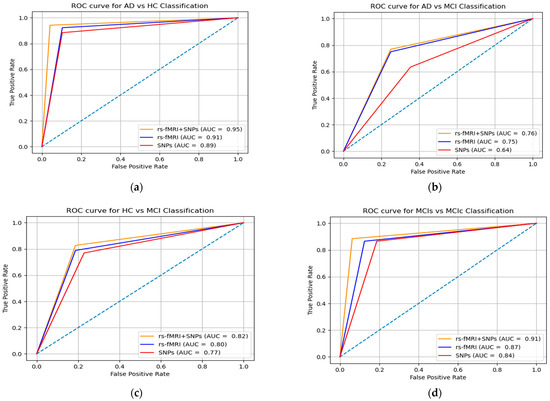 ROC curve (AUC) for individual features set and combination of SNPs and rs-fMRI nodal networks features matrix using MKL-SVM: (a) AD vs. HC, (b) AD vs. MCI, (c) HC vs. MCI, and (d) MCIs vs. MCIc.
