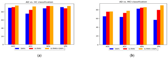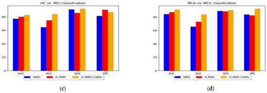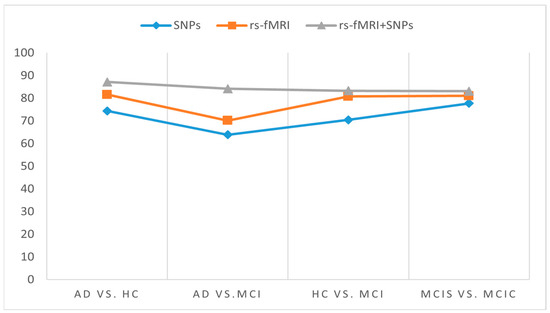The specificity and sensitivity in Table 3 and the AUC shown in Figure 5 were determined to assess the effectiveness of the MKL-SVM classifier among RF and XGB using the combined feature vectors. Our classification process using brain nodal networks and SNPs feature combinations produced the best performance with 93.03% accuracy, 95.15% sensitivity, 94.17% specificity, 87.17% Cohen’s kappa, and 95.13% AUC for AD vs. HC classification. Similarly, for the MCIs vs. MCIc classification, we obtained 83.73% accuracy, 90.31% sensitivity, 92.37% specificity, 83.09% Cohen’s kappa index, and 91.07% AUC. For the AD vs. MCI classification, we obtained 77.43% accuracy, 85.75% sensitivity, 90.01% specificity, 76.00% AUC, and 84.15% Cohen’s kappa index. Similarly, for the HC vs. MCI classification, we obtained 84.01% accuracy, 92.13% sensitivity, 87.17% specificity, 82.79% AUC, and 83.31% Cohen’s kappa index, as shown in Figure 6. Overall, MKL-SVM exhibited a better performance, but for AD vs. MCI classification on rs-fMRI features, there was a similar performance accuracy with RF and XGB.