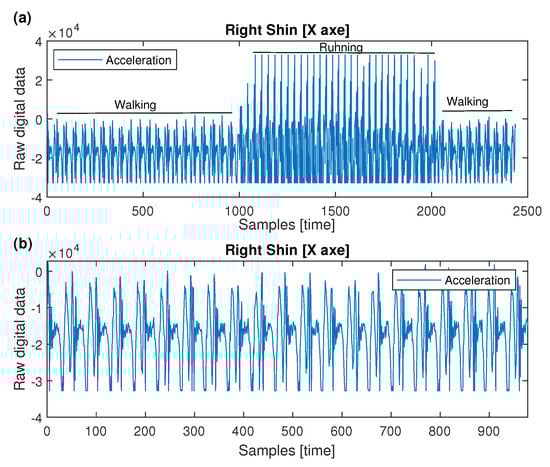 This work intends to start from the raw accelerometer signal in our proposed methodology. This approach was used by other works, such as in [9], where they obtained good results in processing time, or in [30], where nuances could be unintentionally removed from the raw features when the parameters are extracted. We intend to model a classifier with less data and less processing time. For instance, Figure 2a illustrates a raw signal containing two activities, and Figure 2b presents only one signal corresponding to the walking activity from the right shin. As in [9], we use the raw acceleration data directly as input to study and transform the signal.