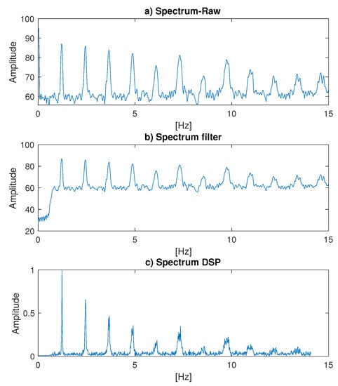 As an example, in Figure 3a, we can see the signal spectrum with one pulse at 0 Hz (DC noise), and the pass-high filter removes the noise (Figure 3b).