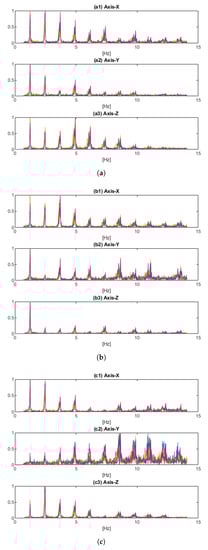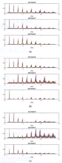 FFT’s performance depends on the signal’s length, and to improve its speed, the Cooley/Tukey algorithm is used through the Matlab fft function, which exploits the symmetries to reduce a large DFT into smaller DFTs. This process helps reduce computational complexity from to , improving speed [33]. Our research used the entire IMU signal for the FFT operation and transformed it separately for each patient.