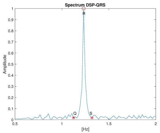 The key element of extracting these frequency amplitudes is setting, and appropriate threshold tolerance, which is used by the QRS algorithm [35]. This technique is used in spectrum analysis to recognize QRS complexes, reducing false detections caused by interferences in ECG signals. Figure 6 shows an example of the QRS detection, where R is the peak of the principal spectrum, Q is the start of the peak signal, and S is the end of the peak signal, which will be unnecessary for our application, as explained later.