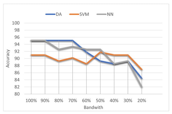 Figure 8 summarizes the accuracy obtained for each bandwidth. It can be observed that the precision of the DA classifier does not change up to a bandwidth of 70%. In addition, it can be observed that the NN classifier has good precision in the range of 90% to 50%, although it slowly decreases when the bandwidth is shortened. Lastly, the SVM classifier presents the worst overall performance, although it is quite robust to the reduction of training data, having even better performance with only 30–50% of the bandwidth. From these results, we can extract that using 70% of the bandwidth with the DA classifier produces the same accuracy as if 100% bandwidth is used. Therefore, data can be reduced to 5615 features to improve the training time of the classifiers, obtaining the same outcomes.