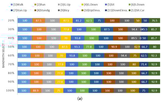 Figure 9 depicts the behavior of the classifiers when changing the bandwidth for each type of activity. Each of the classifiers has obtained excellent performances for most of the activities. For instance, walking, going up the stairs, and going up with the elevator only needed a primary spectrum in the 20% window of bandwidth, independently of the classifier; however, other activities need a wider bandwidth to be recognized. However, to obtain excellent general performance, more data are required. The DA classifier, shown in Figure 9a, can perfectly recognize up to nine activities with 70% bandwidth. SVM and NN (Figure 9b,c) reflected similar performances except for the elevator and going downstairs. However, they improve the recognition of the car-sitting activity, reaching 100% accuracy with 40% and 50% bandwidth, respectively.