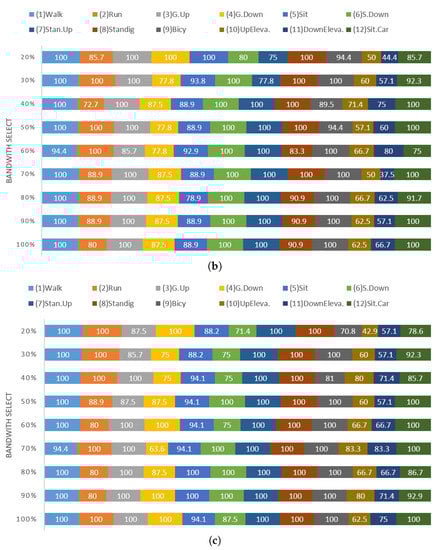 Human Activities Accuracy with Bandwidth Select. (a) DA—Discriminant Analysis Classification. (b) SVM—Support Vector Machine Classification. (c) NN—Neural Network Classification.