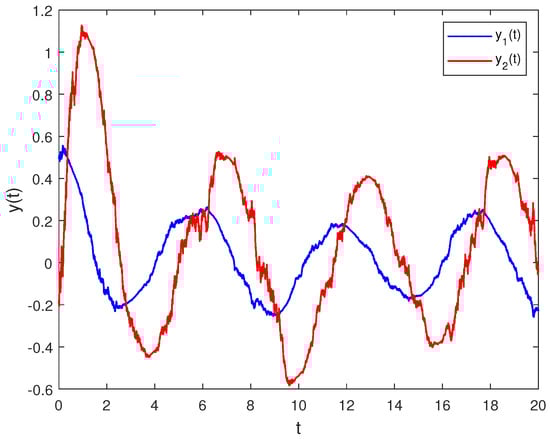 The simulation results are as follows. For the initial condition , in Figure 1, the state is unstable for stochastic systems (17) without stabilizing impulses. According to Figure 2 one can see that the state is stable for stochastic systems (17) with stabilizing impulses. We can derive that the impulses contribute to the stability of the system state.