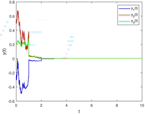 For the initial value , Figure 3 and Figure 4 indicate that the solution of system (18) with stabilizing impulses is asymptotically stable. As we observe, the convergence time of the state trajectory is shorter for the system (18) with impulsive effects.