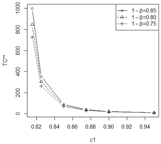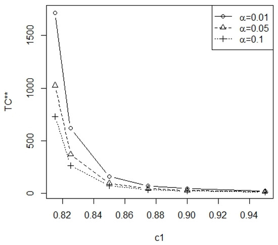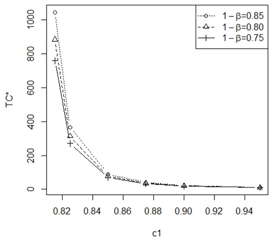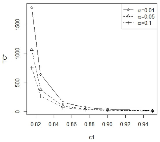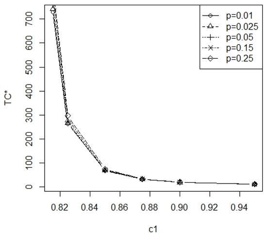 From Table A1 and Table A2, the optimal number of inspection intervals m is nonincreasing when is increasing and the range of m is 2~6. In Figure 3, the plot of the minimum total cost TC* vs. for = 0.01, 0.05, 0.1 at = 0.25 and p = 0.05 is displayed. In Figure 4, the plot of the minimum total cost TC* vs. 1 − = 0.75, 0.80, 0.85 at = 0.1 and p = 0.05 is displayed. In Figure 5, the plot of the minimum total cost TC* vs. p = 0.05, 0.075, 0.1 is displayed at = 0.1 and = 0.25. From Figure 3, it can be observed that, as the level of significance increases, there is a decrease in the minimum total cost TC*. From Figure 4, it can be observed that, as the test power increases, there is an increase in the minimum total cost TC*. From Figure 5, it can be observed that, as the removal rate p increases, there is an increase in the minimum total cost TC*. Furthermore, these three figures show that the minimum total cost TC* is a deceasing function of . According to Table A1 and Table A2, the required minimal number of inspection intervals is inversely proportional to .