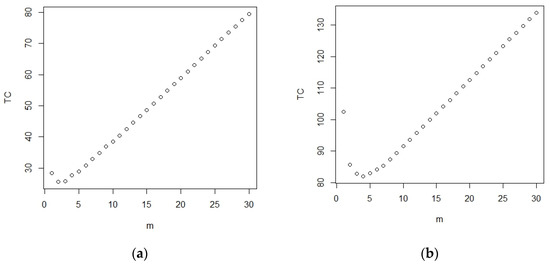 Consider Co = 1, a = 2, and b = 1. For testing with = 0.15, = 0.05, p = 0.01, c1 = 0.95, L = 0.1, and T = 0.8, the curve of total cost with m = 1:m0 is displayed in Figure 2a. It can be seen that the minimum total cost occurred at m = 2, with a total cost of 13.8. For a different set up of parameters = 0.25, = 0.05, p = 0.05, c1 = 0.90, another curve of total cost with m = 1:m0 is displayed in Figure 2b. You can see that the minimum total cost occurred at m = 2, with a total cost of 25.8.