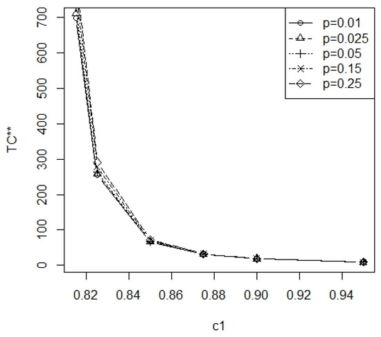 From Table A3 and Table A4, the optimal required minimal number of inspection intervals is inversely proportional to and the range of m is 2~10. The optimal length of inspection interval t* is within 0.15 and 0.22 unit of times for = 0.825. The values of t* are within 0.18 and 0.28 units of time for = 0.875. The values of t* are within 0.21 and 0.37 units of time for = 0.875. The values of t* are within 0.23 and 0.37 units of time for = 0.90. Figure 7 displays a graph showing the relationship between the minimum total cost TC** and for = 0.01, 0.05, 0.1 at = 0.25, and p = 0.05. Figure 8 displays a graph showing the relationship between the minimum total cost TC** and for 1 − = 0.75, 0.80, 0.85 at = 0.1, and p = 0.05. Figure 9 displays a graph showing the relationship between the minimum total cost TC** and for p = 0.01, 0.025, 0.05, 0.15, 0.25 at = 0.1 and = 0.25. From Figure 7 and Figure 8, it can be seen that the minimum total cost TC** is a decreasing function of or an increasing function of 1 − . From Figure 9, it can be seen that, as the removal rate p increases, there is an increase in the minimum total cost TC**. Furthermore, the minimum total cost TC** deceases as increases.