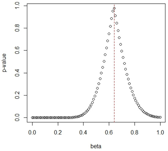 To test the goodness of fit of the Chen distribution, we employ the Gini statistic suggested by Gill and Gastwirth [18]. The p-value of this test is a function of β and the p-value versus the β value from 0 to 1.0 is given in Figure 10. From Figure 10, the value of β = 0.64 is determined with the largest p-value of 0.9788521. The large p-value indicated that the data fitted the Chen distribution very well. We also conducted the Kolmogorov-Smirnov test (ks. test in R) with a p-value of 0.781, which fitted the Chen distribution as well.