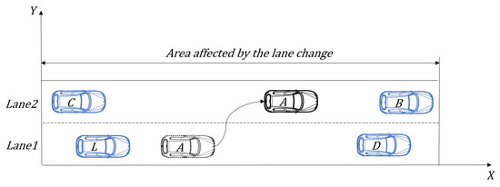 - State : State of the entire lane change system, including CAV A and surrounding vehicles. The system coordinate is shown in Figure 1, based on which, the state information can be described by the longitudinal position, lateral position and velocity of all vehicles, as shown in Equation (22):where the velocity limit is related to the current visibility of the highway.