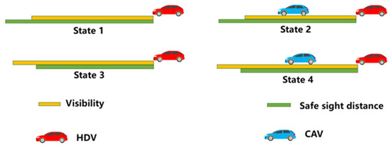 - The longitudinal spacing between CAV A and HDV C is greater than the visibility.State 1: visibility is less than the safe sight distance of HDV C and there is no vehicle ahead in visibility.State 2: visibility is less than the safe sight distance of HDV C and there is a vehicle ahead in visibility.State 3: visibility is greater than the safe sight distance of HDV C and there is no vehicle ahead in visibility.State 4: visibility is greater than the safe sight distance of HDV C and there is a vehicle ahead in visibility.