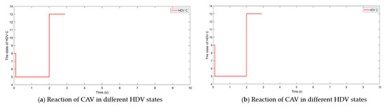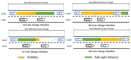 - The longitudinal spacing between CAV A and HDV C is less than the visibility.State 5: CAV A is in the lane change state.State 6: CAV A has not started lane change, visibility is less than the safe sight distance of HDV C and there is no vehicle ahead in visibility.State 7: CAV A has not started lane change, visibility is less than the safe sight distance of HDV C and there is a vehicle ahead in visibility.State 8: CAV A has not started lane change, visibility is greater than the safe sight distance of HDV C and there is no vehicle ahead in visibility.State 9: CAV A has not started lane change, visibility is greater than the safe sight distance of HDV C and there is a vehicle ahead in visibility.State 10: CAV A completes lane change, visibility is less than the safe sight distance of HDV C and there is no vehicle ahead in visibility.State 11: CAV A completes lane change, visibility is less than the safe sight distance of HDV C and there is a vehicle ahead in visibility.State 12: CAV A completes lane change, visibility is greater than the safe sight distance of HDV C and there is no vehicle ahead in visibility.State 13: CAV A completes lane change, visibility is greater than the safe sight distance of HDV C and there is a vehicle ahead in visibility.
