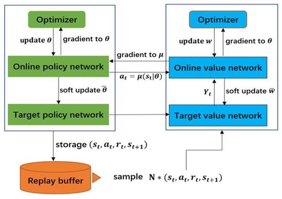 - Discount factor : We use the action value function to evaluate the goodness of the current action, and the value function is updated to consider future rewards with discounts , as shown in Equation (31):where is the reward corresponding to the state and action at moment . is a dynamic model of the system that represents the probability of the system changing from state to state after taking action .
