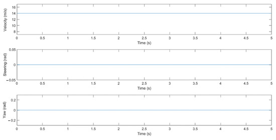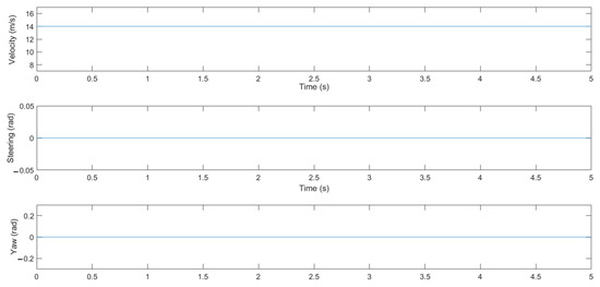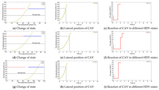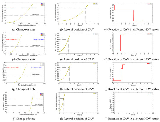 | Initial velocity of HDV B Initial longitudinal position of HDV B Initial longitudinal position of HDV C Initial lateral position of HDV B Initial lateral position of HDV D * Aggression factor of HDV C | 14 100 0 4.5 1.5 −3~3 | Initial velocity of HDV D Initial longitudinal position of HDV D Initial lateral position of CAV A Initial lateral position of HDV C Initial longitudinal position of CAV A | 14 100 1.5 4.5 15~85 |