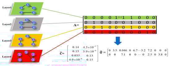 A toy example is further used to describe the procedure of Equation (7). As shown in Figure 1, the simple multilayer network consists of four layers and five nodes. Each row of the matrix represents the vectorized version of the adjacency matrix related to the layer. Applying the updating rules in Equations (13) and (14), we obtain the estimated layer membership matrix and the estimated shared structure information matrix . After that, we use K-means on to obtain the layer groups. Then, by Equation (15), we construct two matrices and based on two rows of , respectively. Each constructed matrix is treated as the potential representation of the related layer group.
