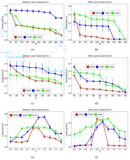 where and . Notice that values of govern the strength of the assortative (disassortative) feature of the network. Roughly speaking, the network is assortative if and disassortative if , and the community structure becomes obscure as closes to 1. We increase the number of nodes n from 40 to 400 and record the between-layer clustering error results and within-layer clustering error results of three methods in Figure 2a,b. As expected, both types of errors rates for all three methods decrease substantially as n becomes large, implying the effect of number of nodes on clustering errors. As , the plots demonstrate that MFSE always achieves superior or comparative performances in both between-layer and within-layer clustering.