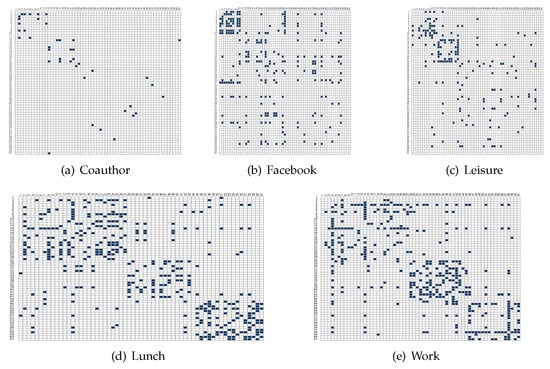 (a–e) Adjacency matrices of five layers on AU-CS network with nodes arranged according the community labels obtained by MFSE.
