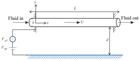This section presents an overview of the system model of the CNT and the mathematical formulation used to describe its dynamics. The governing equations of motion for the CNT and the continuum mechanics principles applied to the CNT system are also presented. The scheme of a clamped–clamped single-walled CNT that uses electrostatic actuation to transport viscous fluid is illustrated in Figure 1.