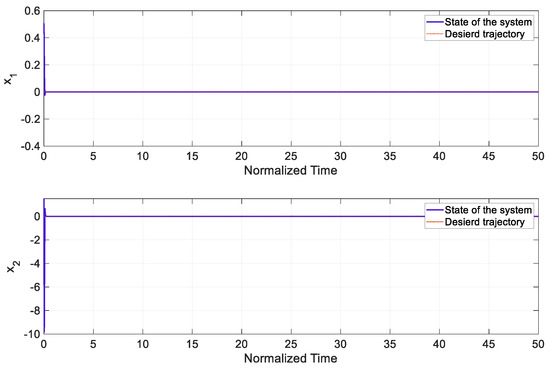 Figure 8 and Figure 9 show the system’s states and chatter-free control input. The tracking control results demonstrate the proposed control scheme’s ability to reach the desired performance. This is evidenced by the stable and smooth behavior of the system, as well as the control input, which does not exhibit any “chatter” or erratic behavior. This suggests that the proposed control method is effective in controlling the system and producing stable and consistent results, even in the presence of disturbances or other challenging conditions.
